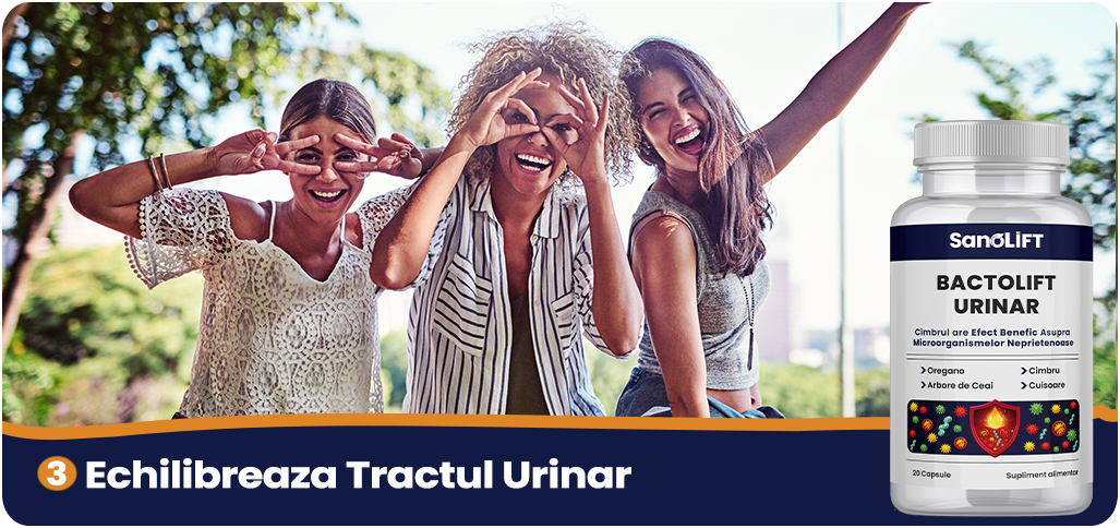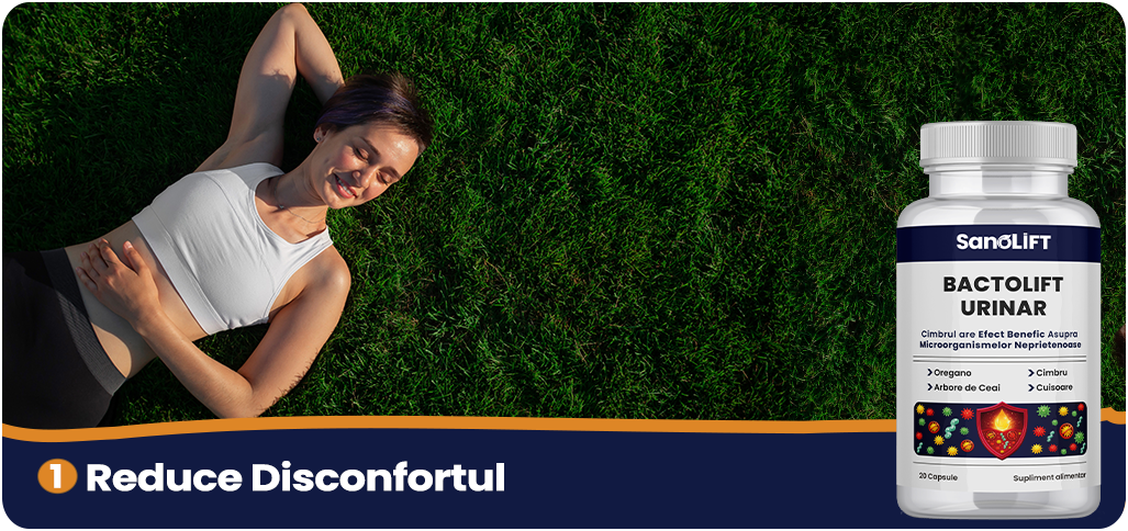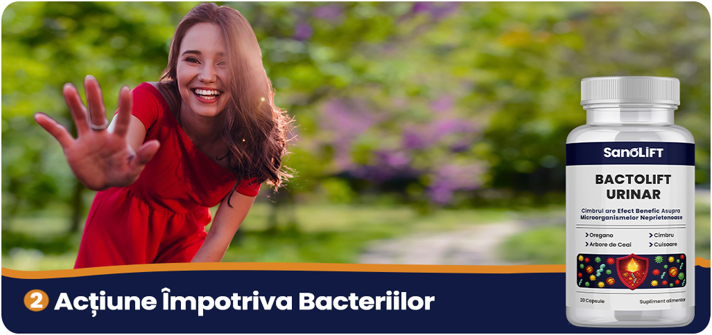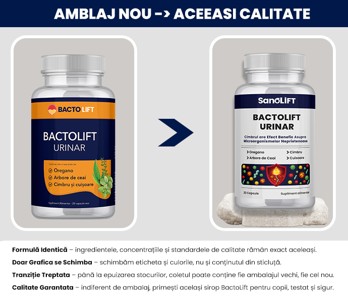 *BactoLift Urinar pe bază de uleiuri esențiale susține sanatate tractului urinar. Rezultatele pot varia de la o persoană la alta. Pentru efecte optime, administrați produsul conform recomandărilor și mențineți o dieta echilibrata.