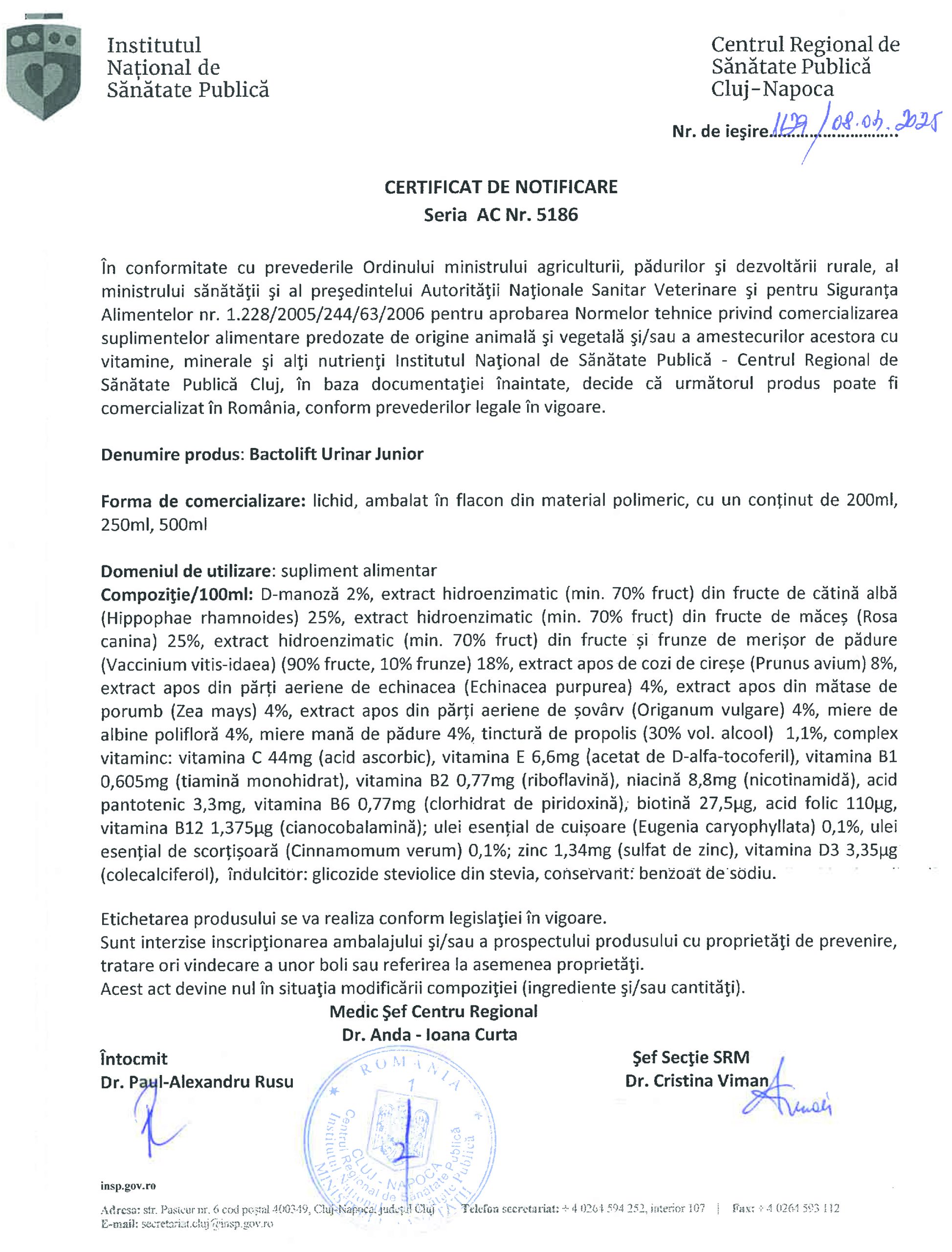 • Siropul BactoLift Urinar Junior este notificat la Ministerul Sănătății.